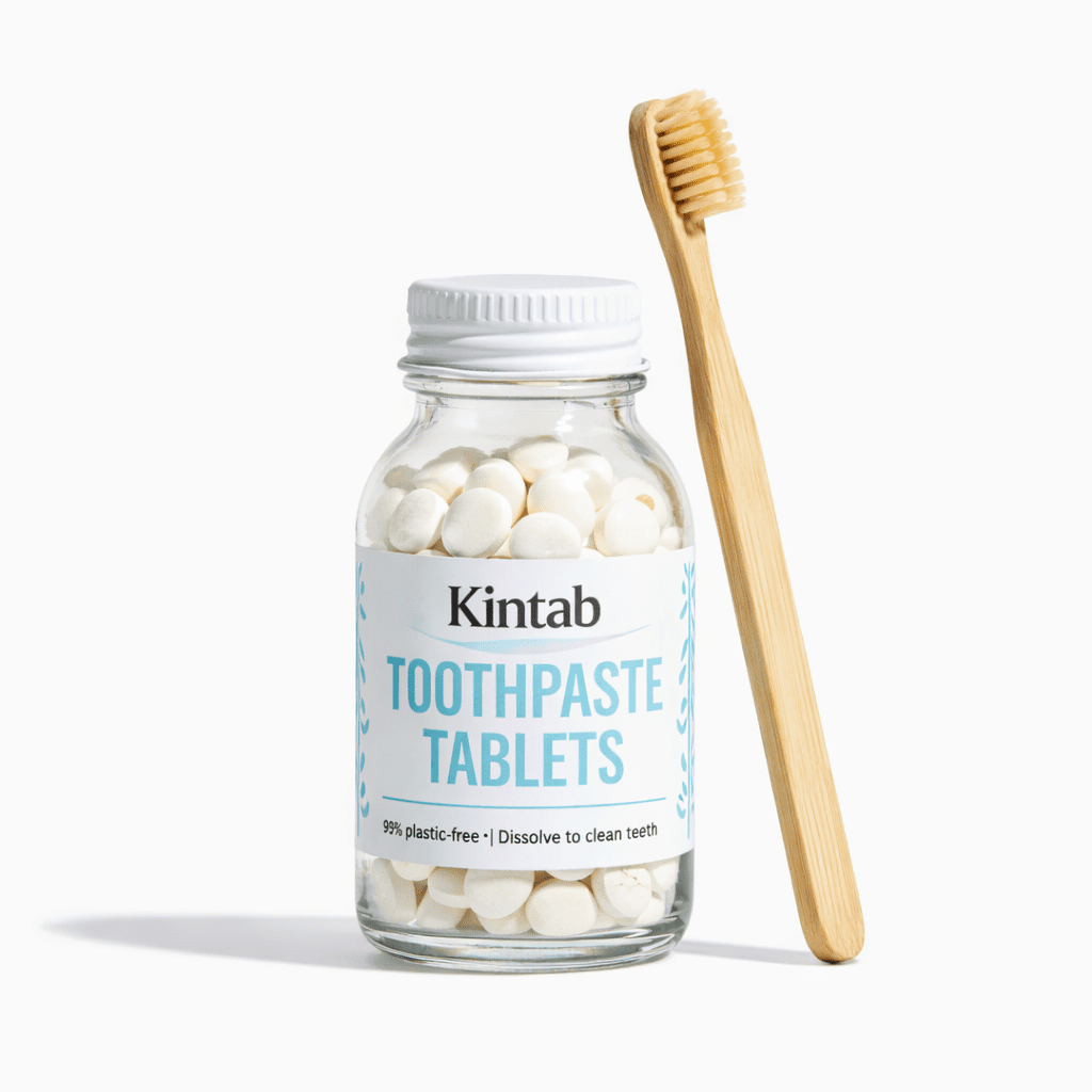 Kintab uses refillable bottles and eliminates single-use toothpaste tubes—helping you brush with significantly less plastic and a clearer conscience.